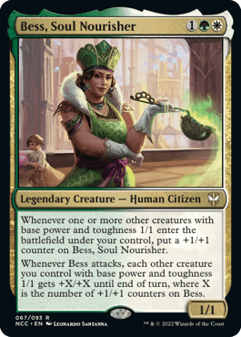 Bess, Soul Nourisher is a three-mana (1GW) 1/1 Human Citizen who gets a +1/+1 counter whenever another creature with base power 1 enters under your control. Her real power lies in her attack trigger: she gives each other creature you control with base power 1 +X/+X until end of turn, where X is the number of +1/+1 counters on Bess herself.
