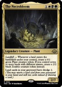 - The Monster – The Necrobloom: Our commander. Its landfall ability creates an ever-growing board of Plants and then Zombies. Its dredge ability allows it to pull sustenance (lands) from the grave, fueling further landfall. Ancient Lumberknot thematically ties to the sentient trees of the bog and mechanically turns The Necrobloom (2/7) into a 7-damage attacker.