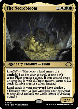 The Commander: The Necrobloom: Our 5-mana Abzan Plant is the heart of the “accidental monster.” Its landfall ability is our primary token engine, creating 0/1 Plants, which then upgrade to 2/2 Zombies once we control seven or more lands with different names – a mini-game representing the monster growing in power as it consumes or corrupts more of the land. The crucial “Land cards in your graveyard have dredge 2” ability allows us to recur lands for more landfall triggers, fill our graveyard for other synergies, and ensure we hit our land drops.