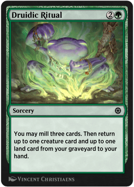 - Her tools and rituals: Bubbling Cauldron (synergizing with her Newt), Nature’s Spiral (the very symbol she uses in her ritual, for recursion), and Druidic Ritual (milling and recursion). Her interest in fungi is represented by the mana-dorking, token-generating Undercellar Myconid.