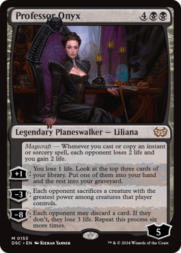 - Professor Onyx: Her Magecraft fuels life gain/drain, and her +1 ability (card selection & self-mill) helps stock our graveyard for The Necrobloom or recursion. Her classroom was where Dina found a key ingredient.