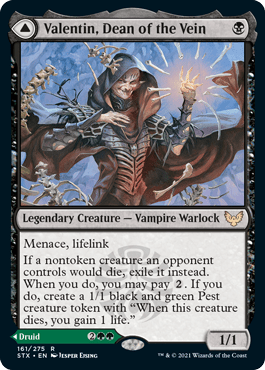 - Valentin, Dean of the Vein // Lisette, Dean of the Root: The Witherbloom deans showcase the college’s duality. Valentin provides early lifelink, graveyard hate, and Pests. Lisette is a powerful life gain payoff, turning vitality into +1/+1 counters and trample for your army.