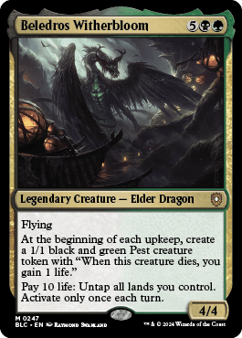 - Beledros Witherbloom: A massive engine, creating Pests every upkeep and offering a powerful (if costly) land untap ability. A prime target for our Fearsome Awakening, which brings her back as a 6/6 flyer!